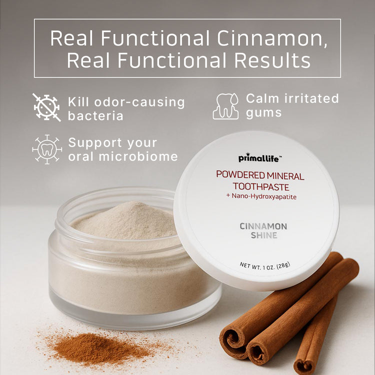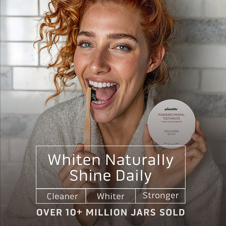 Say goodbye to foamy fillers and fluoride - hello to a warm, comforting clean that actually works. Cinnamon Shine combines enamel-rebuilding nano-hydroxyapatite and mineral-rich clays with functional cinnamon oil that fights bacteria, boosts whitening, and calms inflammation. Experience cleaner, whiter, stronger teeth - completely free of dyes, SLS, and synthetic junk.