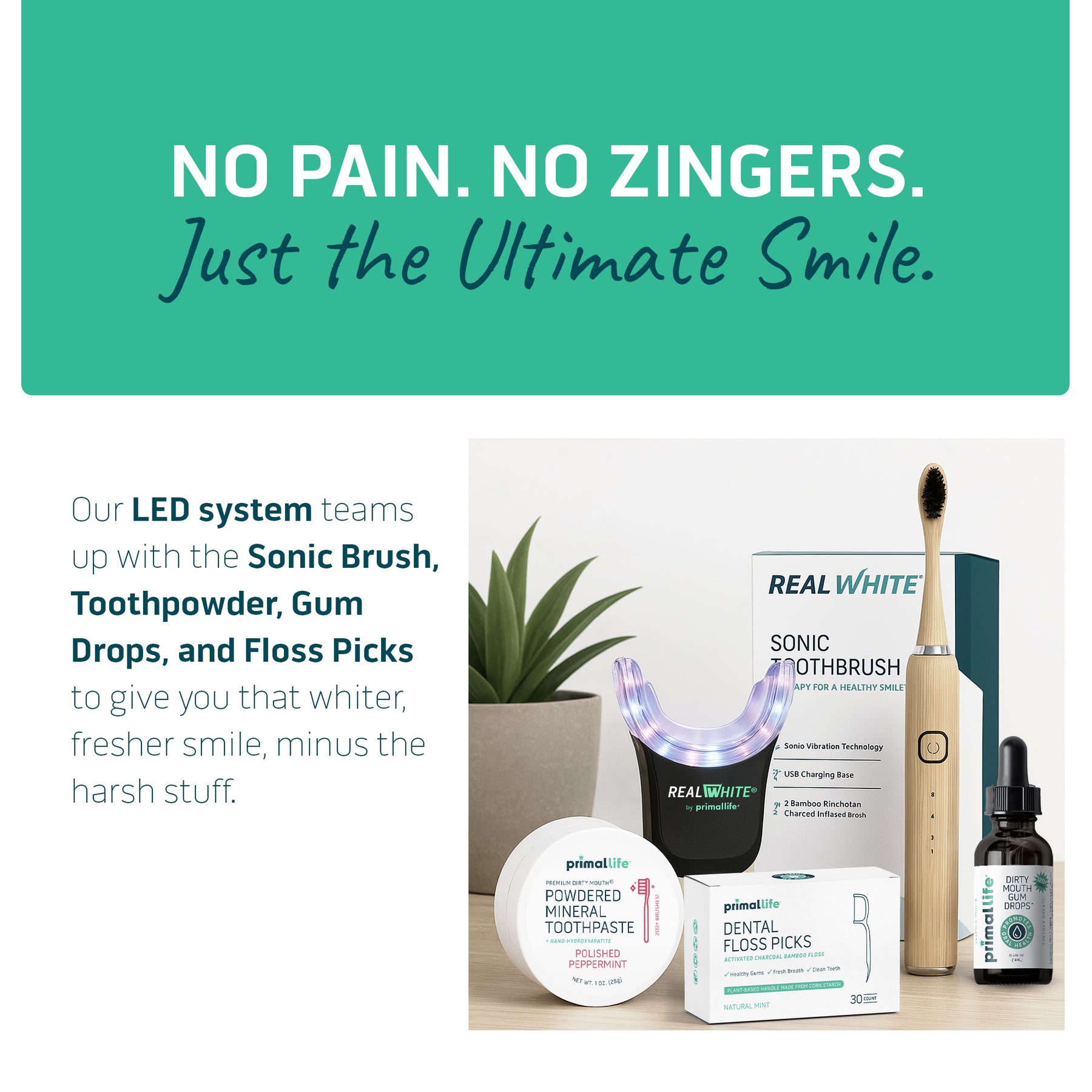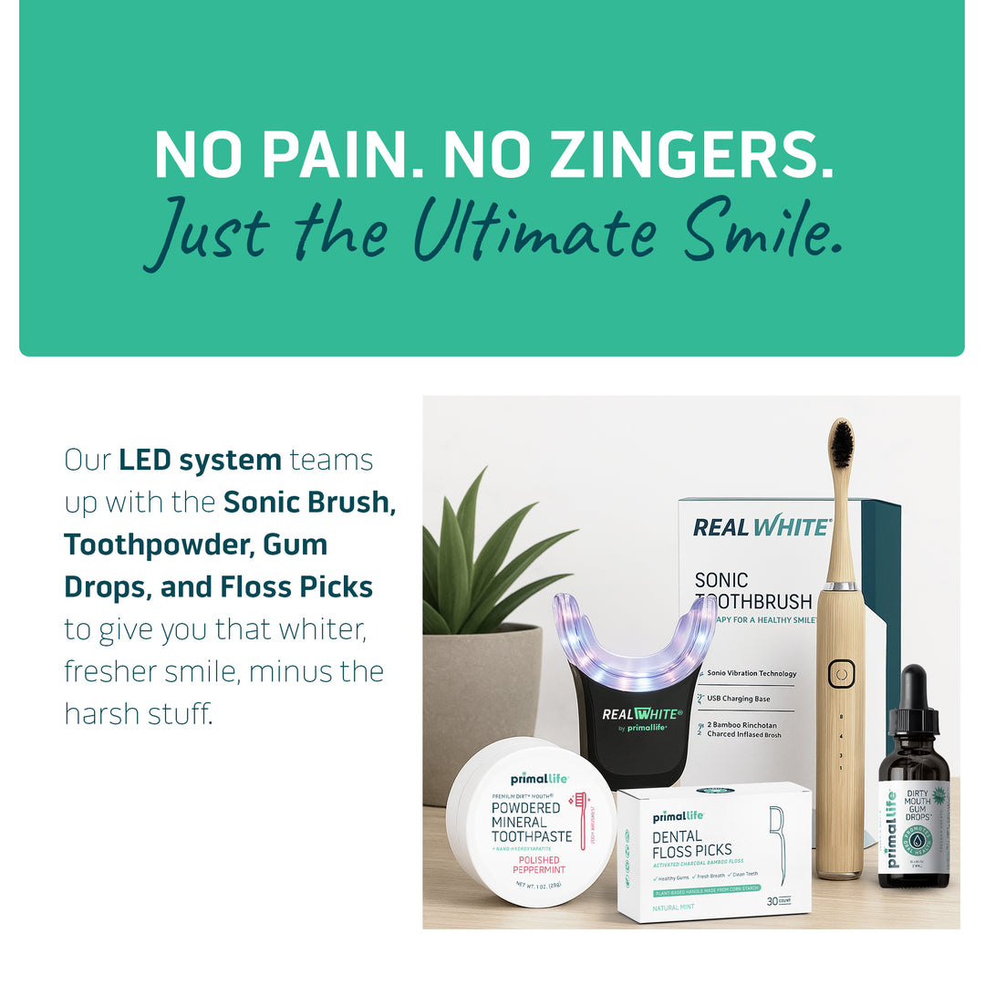 Experience the complete transformation your smile deserves with this comprehensive whitening system. V4 LED light therapy, sonic toothbrush technology, 11-essential-oil gum drops, charcoal floss picks, and mineral-rich toothpowder work together to deliver professional-level results naturally. Everything needed for whiter teeth, healthier gums, and lasting confidence.