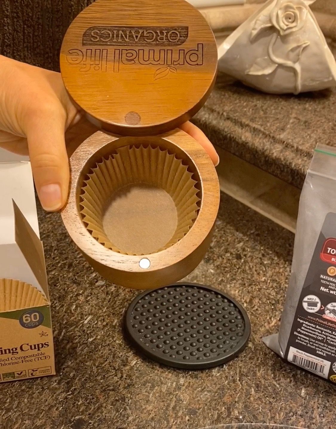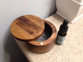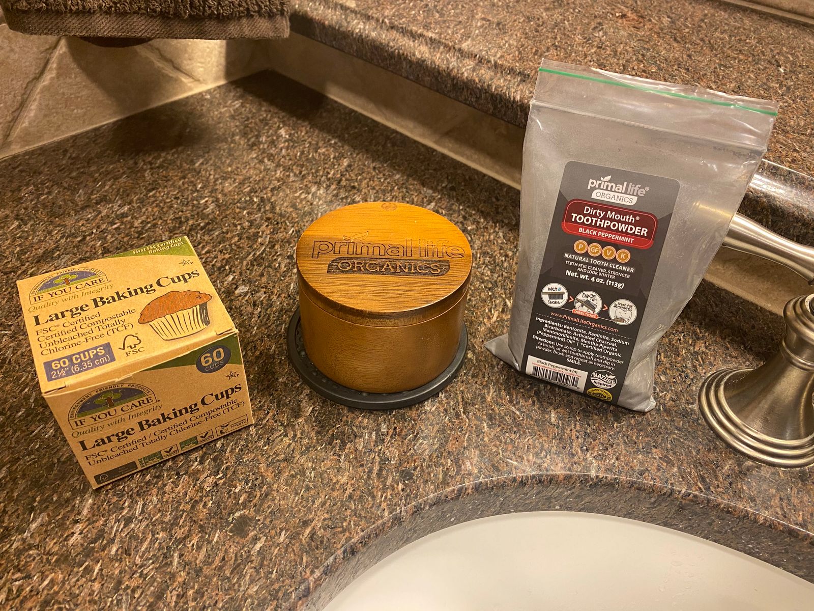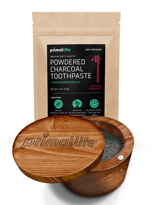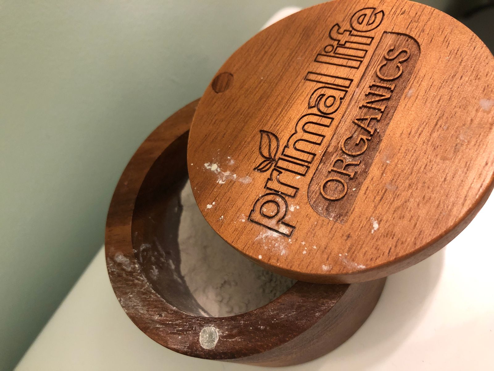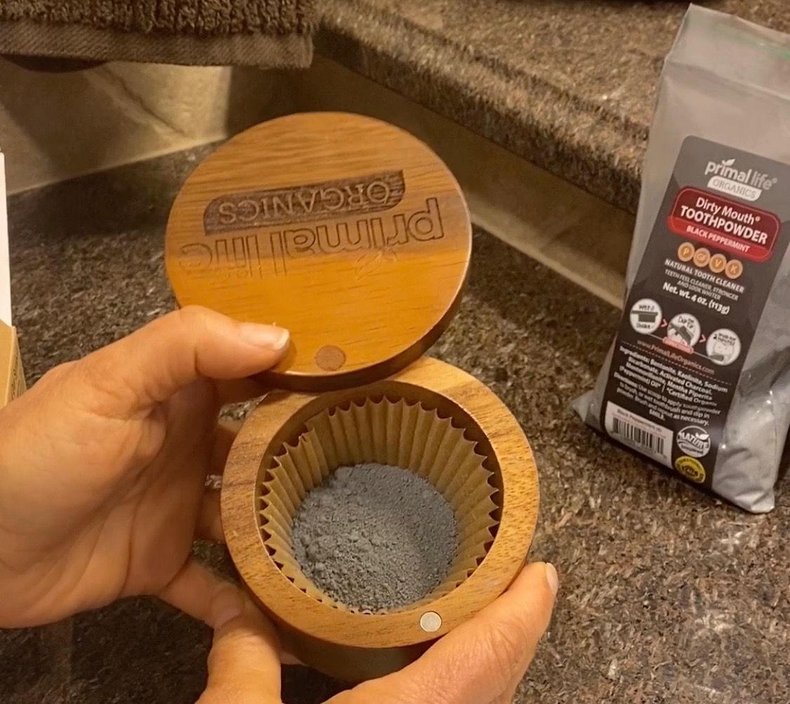 Our eco-friendly, acacia wooden container looks great on your counter and is the perfect “permanent” home for your toothpowder!